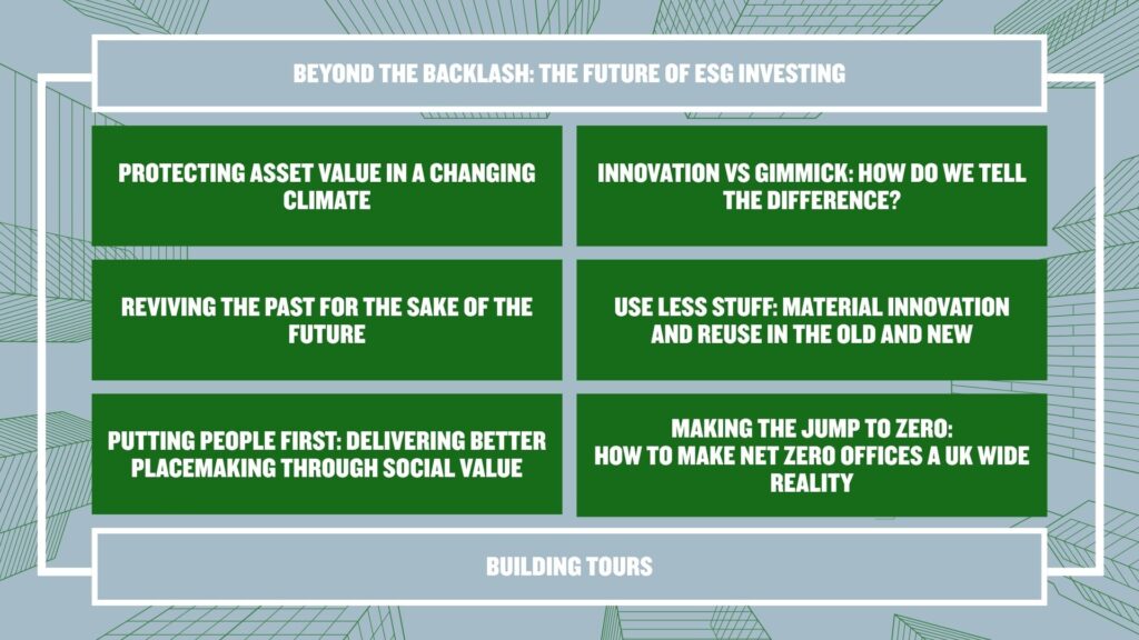 The Summit will open with a keynote address and panel discussion exploring the future of ESG investing. Delegates will then attend three of six concurrent panel sessions, followed by curated building tours.